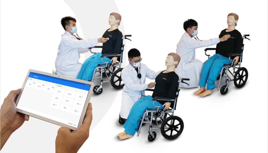 结合临床医学及人体工程设计,行业领先无线智能听诊系统,由控制系统、模拟听诊器、T 恤三部分组成,可营造真实临床环境,用于听诊教学训练及考核;设备使用方式灵活,可穿戴于标准化病人(SP)或标准化模拟人,实现单机或群体化的心音、肺音、肠音等生理性及病理性听诊音的训练及考核。